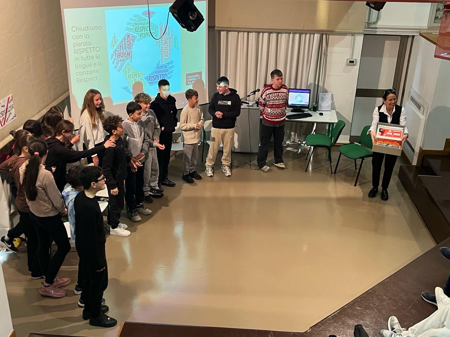 Come fase di “restituzione”, gli alunni della 2D hanno organizzato una presentazione dedicata ai compagni della 2B nel teatrino della scuola, spiegando il loro percorso, i contenuti e il messaggio della rappresentazione teatrale. Gli studenti hanno anche introdotto il nuovo protocollo per la prevenzione al Cyberbullismo in vigore nella Repubblica.