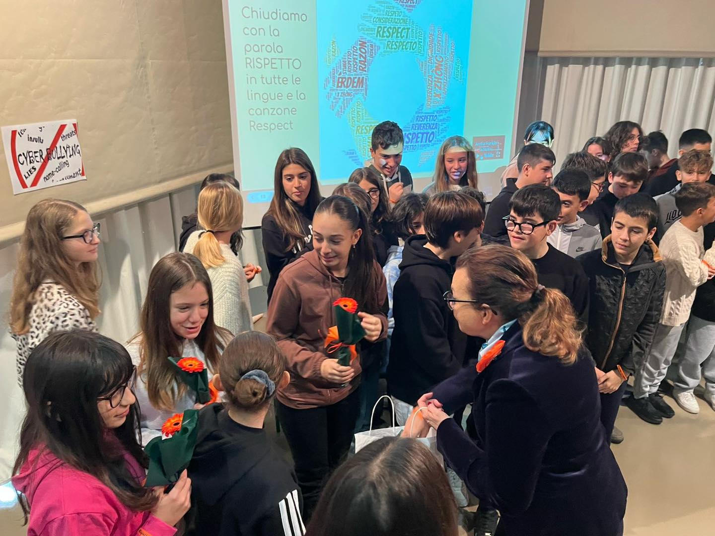 All’incontro erano presenti la Presidente e diverse socie dell’associazione Soroptimist, le quali hanno voluto premiare l’impegno dei ragazzi. Le rappresentanti dell’associazione hanno donato agli studenti dei bracciali arancioni recanti la scritta “rispetto” e fiori arancioni, consolidando il legame tra la scuola e il progetto contro la violenza di genere.