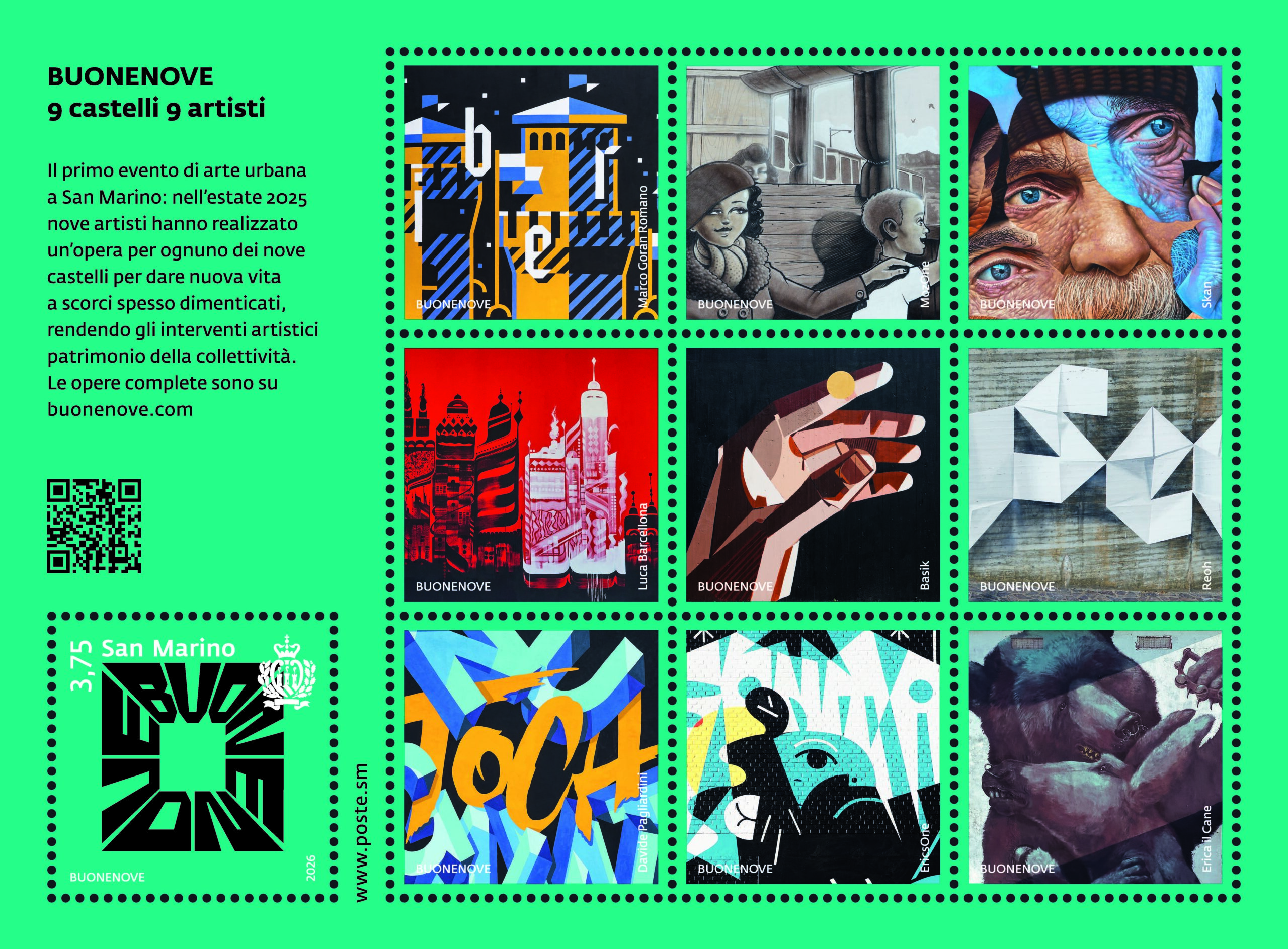 La seconda novità filatelica è invece dedicata a “BUONENOVE”, il primo evento di arte urbana diffuso nella Repubblica. Il progetto, sostenuto dalle Segreterie di Stato per il Turismo, il Territorio e la Cultura, ha coinvolto nove street artist di fama internazionale: Marco Goran Romano, MozOne, Skan, Luca Barcellona, Basik, Reoh, Davide Pagliardini, EricsOne ed Erica il Cane. Ciascun artista ha realizzato un’opera in uno dei nove Castelli di San Marino, con l’obiettivo di riqualificare gli spazi urbani e promuovere le bellezze del Paese anche al di fuori del centro storico.
