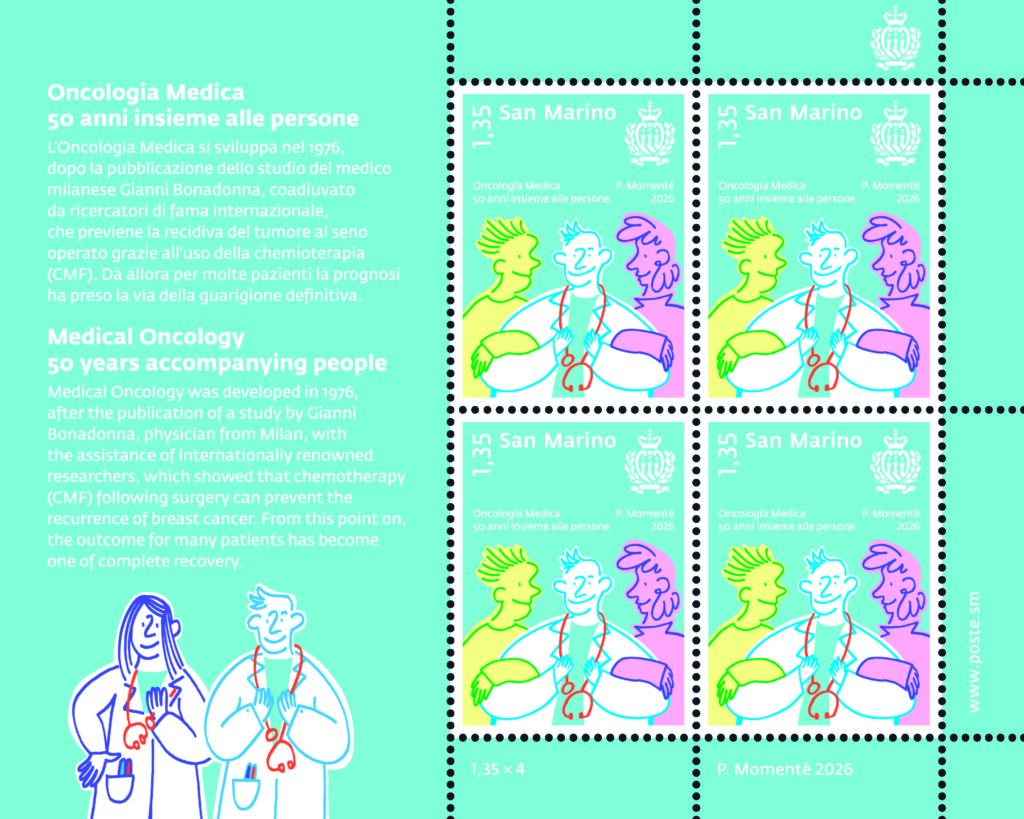La prima emissione celebra un anniversario fondamentale per la scienza. Cinquant’anni fa, nel 1976, il dottor Gianni Bonadonna pubblicava sul New England Journal of Medicine lo studio pionieristico che introduceva l’uso della chemioterapia per prevenire le recidive del tumore al seno. Quell’intuizione segnò la nascita dell’oncologia medica moderna. Per ricordare questa ricorrenza, l’artista Paola Momentè ha realizzato un francobollo (dal valore di 1,35 euro) che punta a sensibilizzare l’opinione pubblica sull’importanza cruciale della prevenzione e della diagnosi precoce. L’opera vuole essere al contempo un tributo di gratitudine verso tutti i professionisti sanitari impegnati quotidianamente nella lotta contro il cancro.