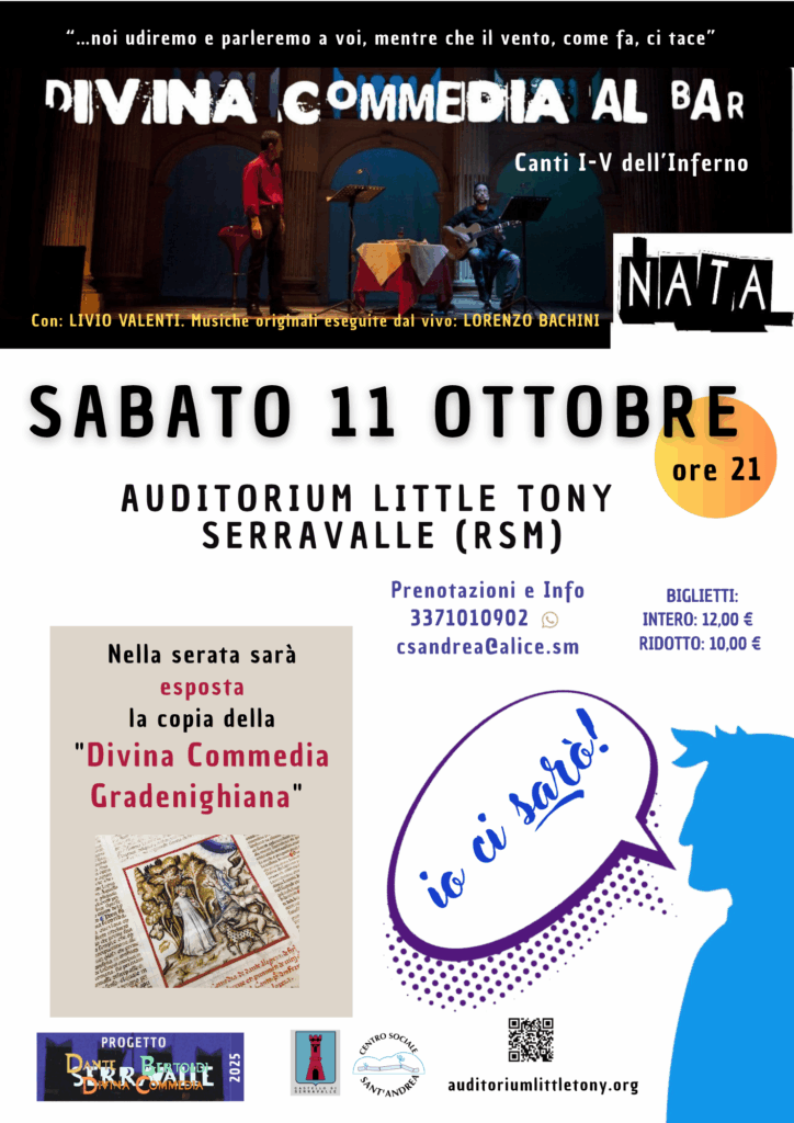 A partire dalle 21 verrà esposta la riproduzione della “Divina Commedia Gradenighiana”, donata dalla Società Imago alla Giunta di Serravalle. A seguire, il pubblico potrà assistere allo spettacolo “Divina Commedia al Bar”, proposto dalla compagnia NATA Teatro: un viaggio insolito e coinvolgente nel capolavoro dantesco, che farà rivivere i Canti I-V dell’Inferno in un’ambientazione contemporanea e sorprendente.