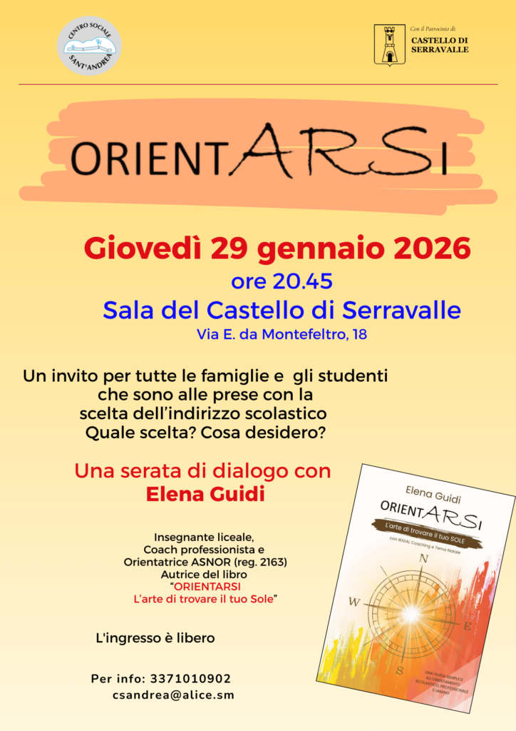 In un comunicato diffuso dal Centro Sociale Sant’Andrea, viene presentato un appuntamento dedicato a uno dei momenti più delicati per le famiglie sammarinesi: la scelta del percorso scolastico. L’iniziativa, intitolata “Orientarsi”, è in programma per dopodomani, giovedi’ 29 gennaio, alle ore 20.45 presso la Casa del Castello di Serravalle.