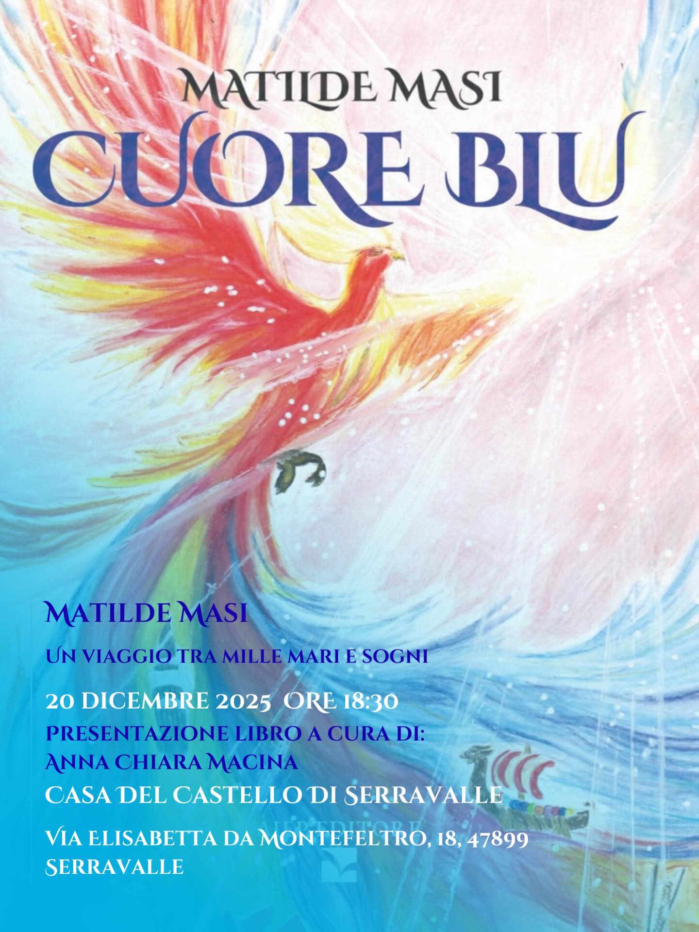 Un viaggio tra mari infiniti, creature fantastiche e la ricerca interiore della speranza. Sono questi gli ingredienti di “Cuore blu”, il romanzo d’esordio della giovane scrittrice sammarinese Matilde Masi, che verrà presentato ufficialmente sabato prossimo, 20 dicembre. L’evento culturale, che punta a valorizzare i nuovi talenti locali, avrà luogo nella cornice della Casa del Castello di Serravalle.