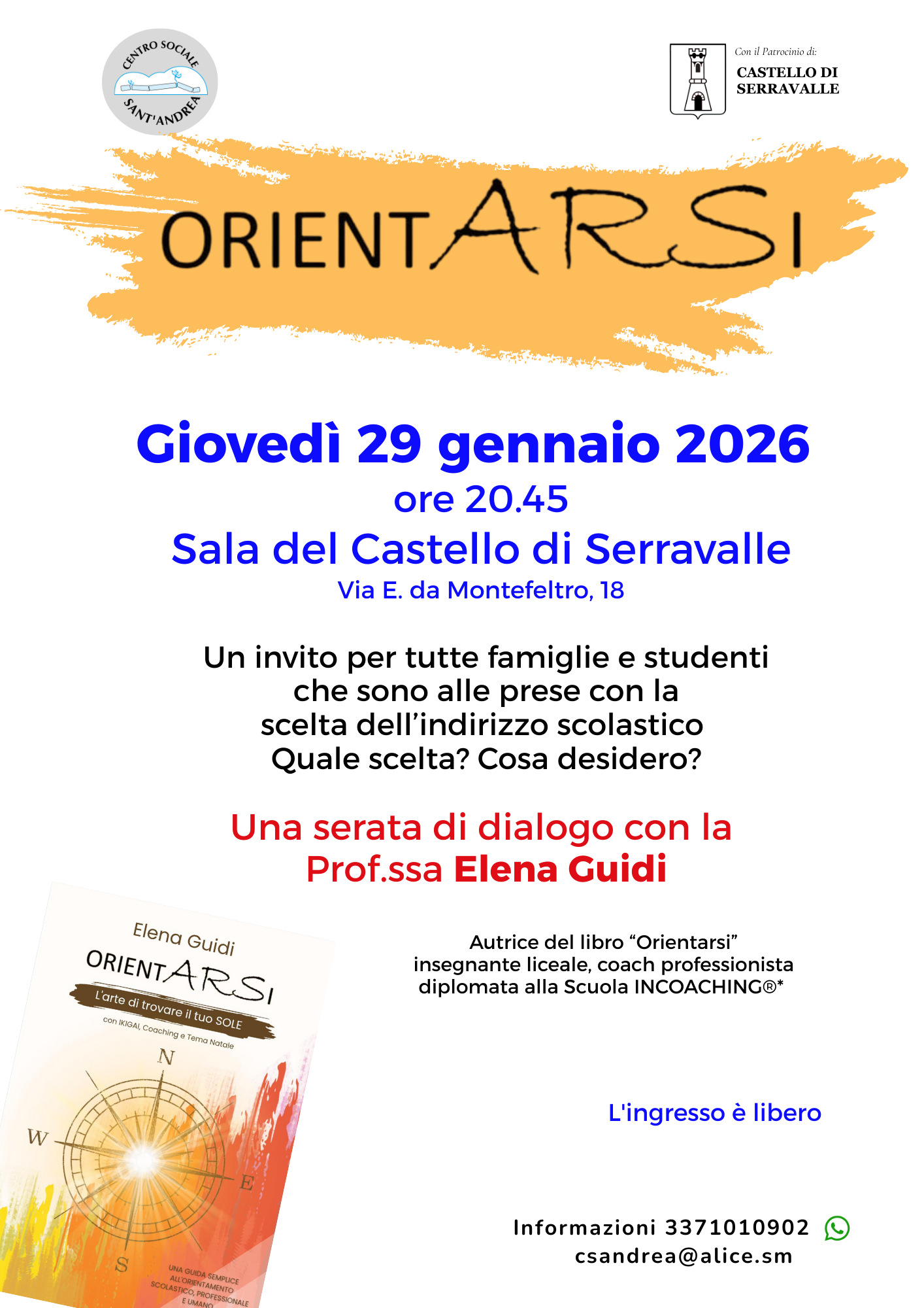 Una bussola per orientarsi nel delicato passaggio tra i banchi di scuola e le sfide del domani. Giovedì prossimo, 29 gennaio, la Sala del Castello di Serravalle ospiterà una serata dedicata a studenti e famiglie chiamati a decidere il proprio percorso formativo. L’iniziativa, promossa dal Centro Sociale S. Andrea, punta a trasformare l’ansia della scelta in un momento di crescita consapevole attraverso il dialogo e il confronto con esperti del settore.