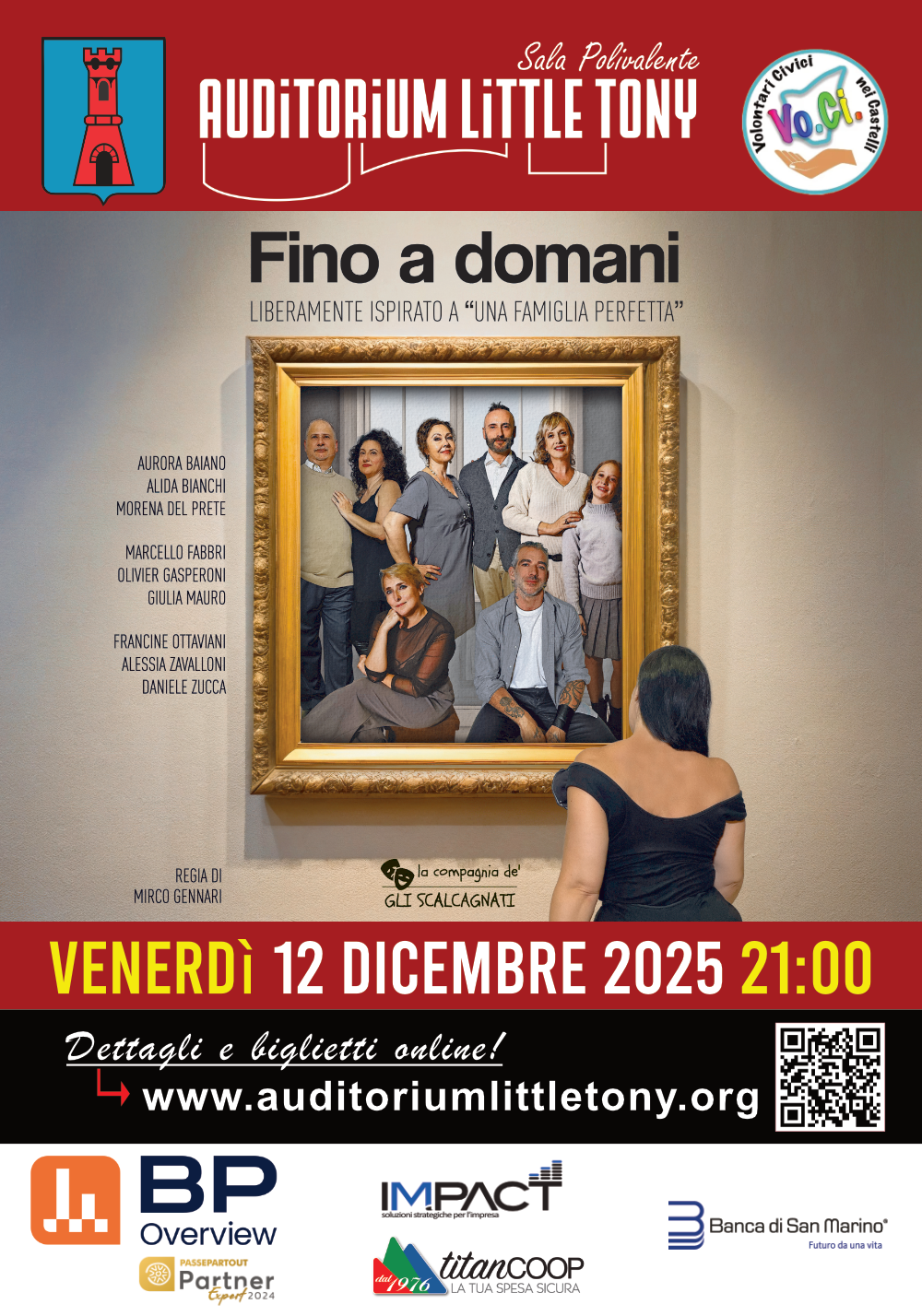 Quando la solitudine del Natale spinge a comprare l’affetto, il confine tra recita e vita vera si assottiglia pericolosamente. È questo il cuore pulsante di “Fino a domani”, la commedia che venerdi’ prossimo, 12 dicembre, illuminera’ il palcoscenico dell’Auditorium Little Tony di Serravalle. Come annunciato in una nota dall’ufficio stampa della struttura, l’appuntamento è fissato per le ore 21.00 e si inserisce nel cartellone della rassegna “Occhi sul Teatro 25-26”.
