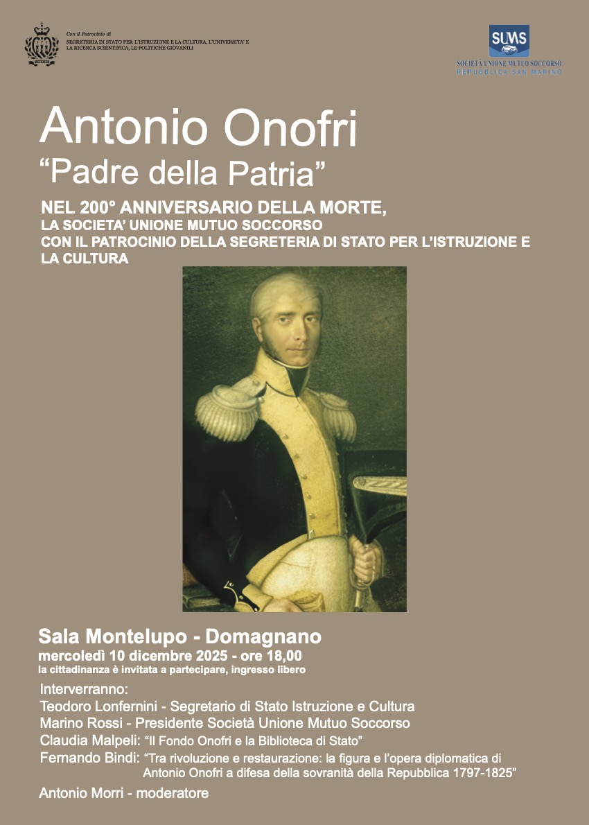 San Marino. SUMS: ”Antonio Onofri, padre della Patria” – mercoledì 10 dicembre alla Montelupo