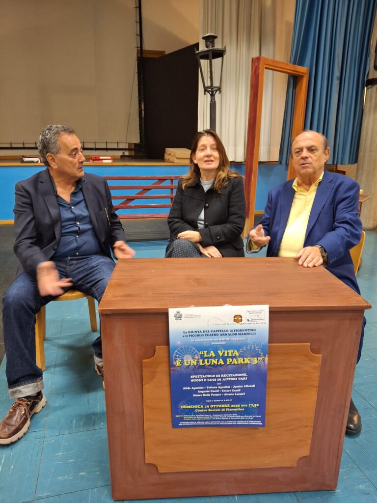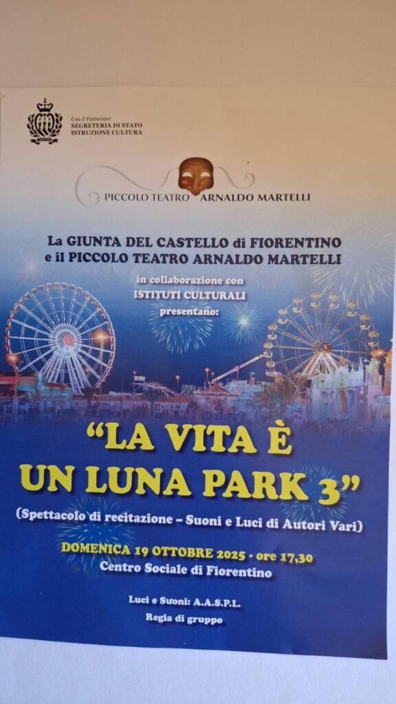 Domenica 19 Ottobre 2025, presso la Sala Teatro del Centro Sociale di Fiorentino, alle ore 17,30, tornano in scena gli attori del Piccolo Teatro Arnaldo Martelli con “LA VITA È UN LUNA PARK 3”. Spettacolo di autori vari, luci e suoni, interpretato da Alida Agostini, Tatiana Agostini, Jessica Allodoli, Augusto Casali, Cesare Casali, Mauro Dellapasqua, Alessio Lazzari. Come in un luna park, la vita è un continuo saliscendi. Così sarà anche lo spettacolo con le sue fasi di stampo quasi cabarettistico. Ci sarà certamente da ridere, ma anche da sorridere un po’ amaramente e riflettere, L’evento è presentato in collaborazione con la Giunta del Castello di Fiorentino, che da anni ospita la nostra Compagnia per la preparazione della tradizionale commedia di Sant’Agata, presso la sala teatro del Centro Sociale locale. Lo spettacolo si svolgerà in tutti gli spazi della sala e sarà tutto a vista, in modo che lo spettatore possa assistere a tutto ciò che accade, in pratica, davanti e dietro immaginarie quinte. Una esperienza che val la pena di essere provata. L’incasso della serata sarà devoluto alla stessa Giunta di Castello di Fiorentino per la realizzazione di un progetto sociale e culturale da realizzarsi sul territorio sammarinese.