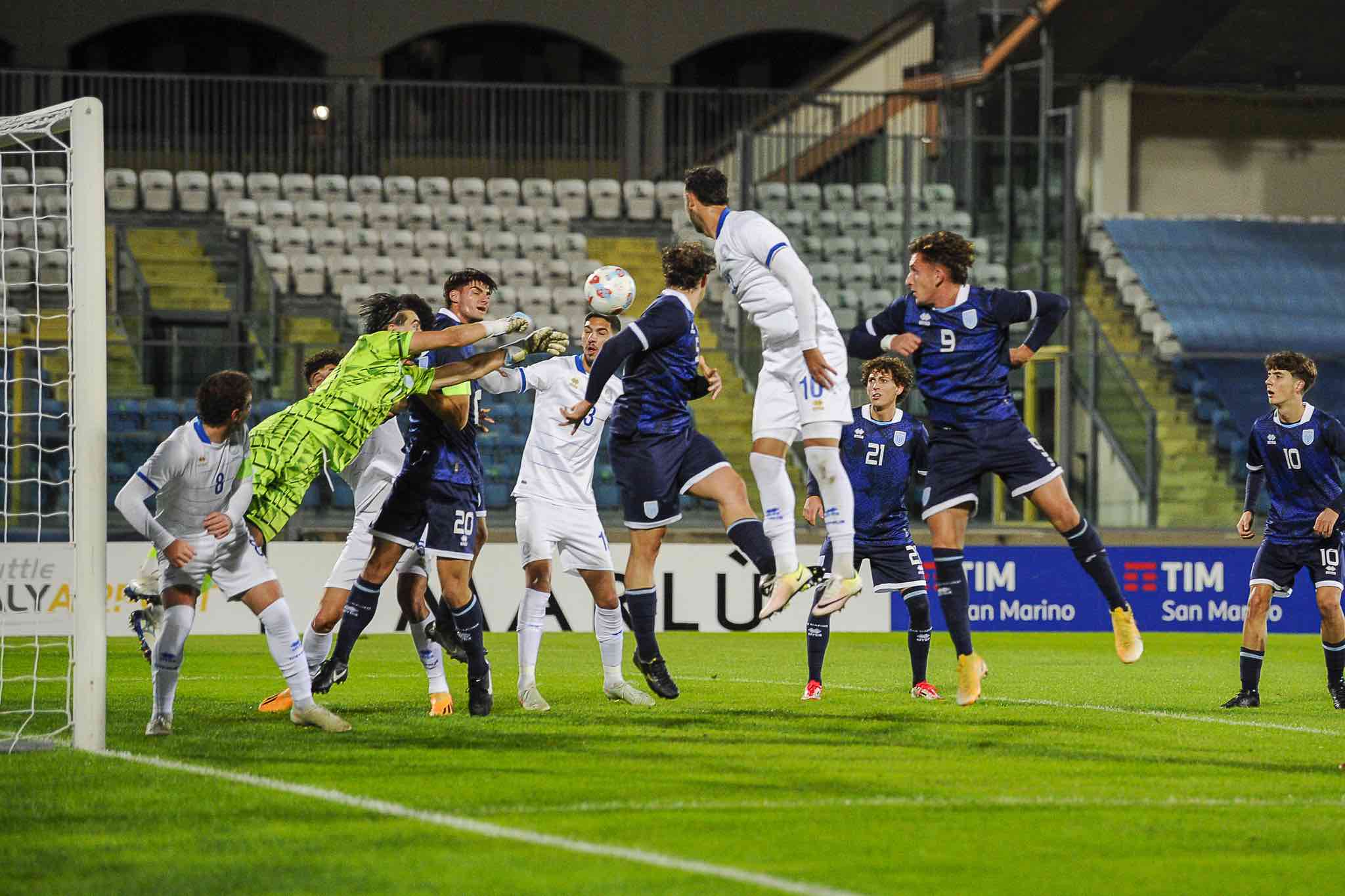 Ad inizio ripresa c’è la novità Arlotti per Pierini. Per Cipro entra Tzouliou, che si mette subito in mostra con una scorribanda in area conclusa con un tiro da ottima posizione: Jacopo Casadei fa gli straordinari con l’aiuto del palo, poi pensa Bugli a pulire l’area piccola. Ancora protagonista, il portiere sammarinese, al 54’: Viktoros lancia profondo per Athanasiou, che si presenta in area, salta Zavoli ma poi deve fare i conti con l’uscita coraggiosa e salvifica dell’estremo di casa. Cipro comunque resta in zona e nel giro di 1’ triplica. Non senza proteste dei padroni di casa, però. Questo perché, sul centro basso di Viktoros, Casadei va per la presa ma Papastylianou mette comunque il piede tra i guantoni del portiere, insaccando da zero metri. Niente fallo per l’arbitro. Si va sul 3-0. Che diventa poker al 63’ grazie alla conclusione pregevolissima di Athanasiou: destro piazzato all’incrocio dei pali e nulla da fare per Casadei. Nel frattempo, però, c’era stato un episodio che aveva infiammato il pubblico dello Stadium. Della Balda aveva inventato un cross perfetto per il taglio sul secondo palo di Sammaritani, entrato da pochissimo. Conclusione di prima intenzione con palla in porta dopo aver dato un ‘bacio’ al palo: tutto inutile, però, perché si alza la bandierina dell’assistente a segnalare fuorigioco, tra tanti dubbi. Entrano intanto, oltre al menzionato Sammaritani, anche Marco Gasperoni e Chiaruzzi. Jacopo Casadei mette le mani sulla conclusione di Neophytou. Poi nel finale i Titani crescono in intraprendenza. Sammaritani va al tiro dopo uno slalom in bello stile, ottenendo la deviazione che vale l’angolo. Poco dopo, Domeniconi cerca la porta dal limite, ma non tiene basso il tiro. Il 4-0 sembra consegnato agli archivi, ma anche nella seconda frazione i minuti conclusivi fanno male. Qui, particolarmente, fanno male quelli di recupero. Jacopo Casadei e Zavoli non si intendono nella primissima costruzione, così Prokopiou irrompe sulla sfera, sbatte sull’uscita del portiere ma lascia la palla nella disponibilità di Neophytou, che arrotonda a porta vuota. Di fatto, è l’ultima azione della partita e anche del 2025 della Nazionale Under 21.