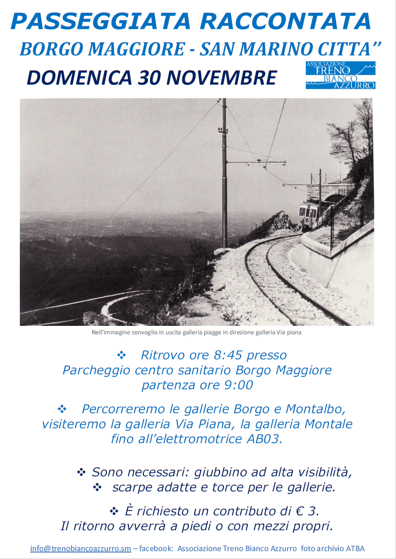 Un tuffo nella storia lungo i binari che non ci sono più. L’Associazione Treno Bianco Azzurro organizza per questa domenica 30 novembre una “passeggiata raccontata” da Borgo Maggiore a San Marino città, un percorso suggestivo attraverso le gallerie della vecchia ferrovia. L’iniziativa, aperta a tutti, permetterà di visitare luoghi solitamente inaccessibili e di riscoprire un pezzo fondamentale del passato del Titano.
