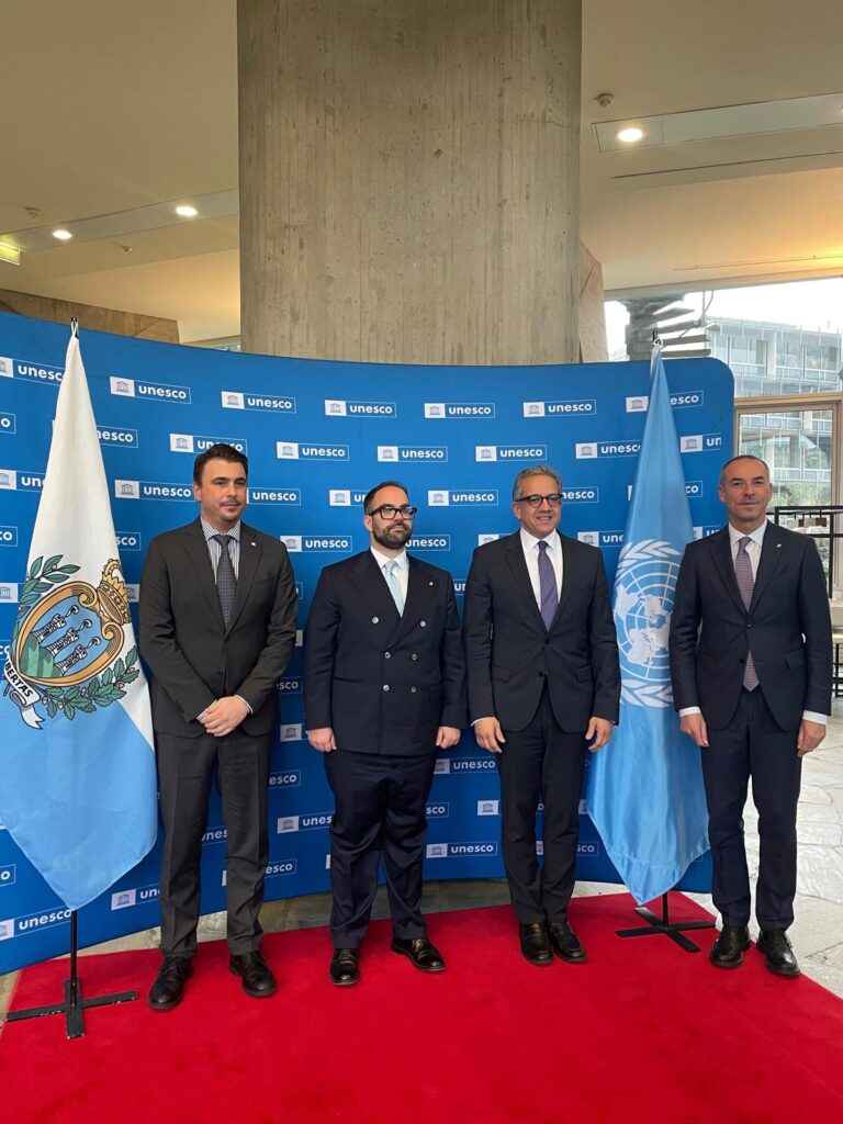 Nella mattinata odierna, a Parigi, presso il Quartier Generale UNESCO, ha avuto corso la Visita Ufficiale dei Capitani Reggenti della Repubblica di San Marino, Matteo Rossi e Lorenzo Bugli, accompagnati dal Segretario di Stato per l’Istruzione e Cultura, Teodoro Lonfernini, e dall’Ambasciatore, Delegato Permanente presso l’UNESCO, Leopoldo Guardigli, con il Direttore Generale UNESCO, S.E. Khaled El-Enany; si tratta della prima Visita Ufficiale di Capi di Stato resa al neo Vertice dell’Organizzazione.