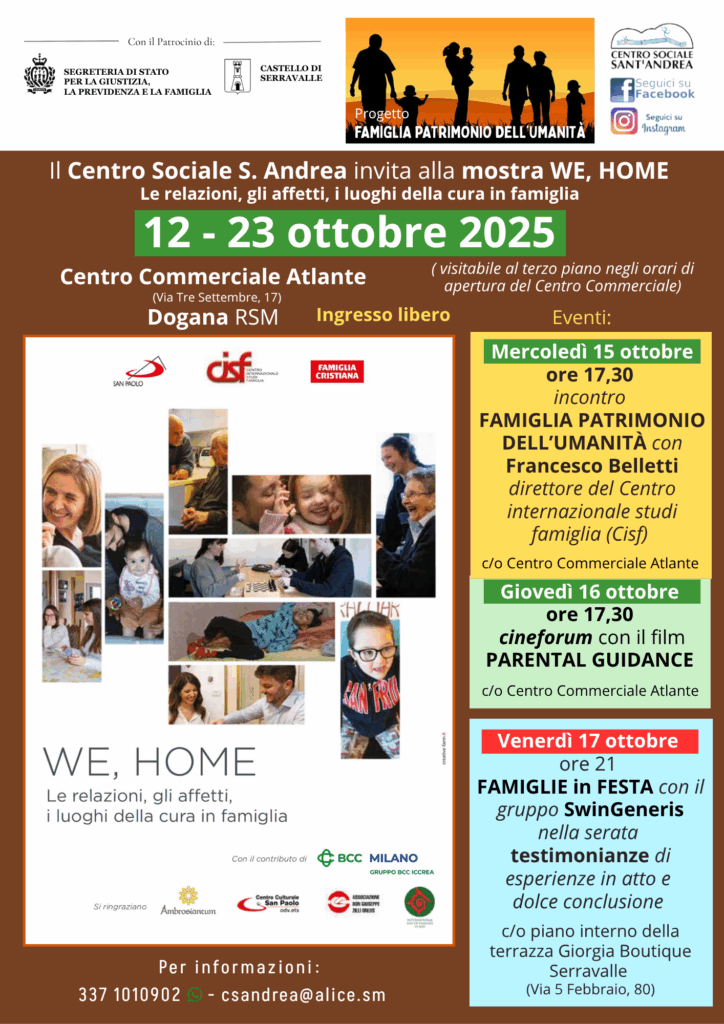 La famiglia come luogo di cura, relazione e quotidianità condivisa. È questo il filo conduttore della mostra fotografica “We, Home”, che sarà inaugurata domenica 12 ottobre alle 15.30 al Centro Commerciale Atlante di Dogana (terzo piano). L’esposizione, visitabile fino al 23 ottobre, è parte del progetto Famiglia patrimonio dell’umanità promosso dal Centro Sociale S.?Andrea e dal Cisf con il patrocinio della Segreteria di Stato per la Giustizia, la Previdenza e la Famiglia e della Giunta di Castello di Serravalle.