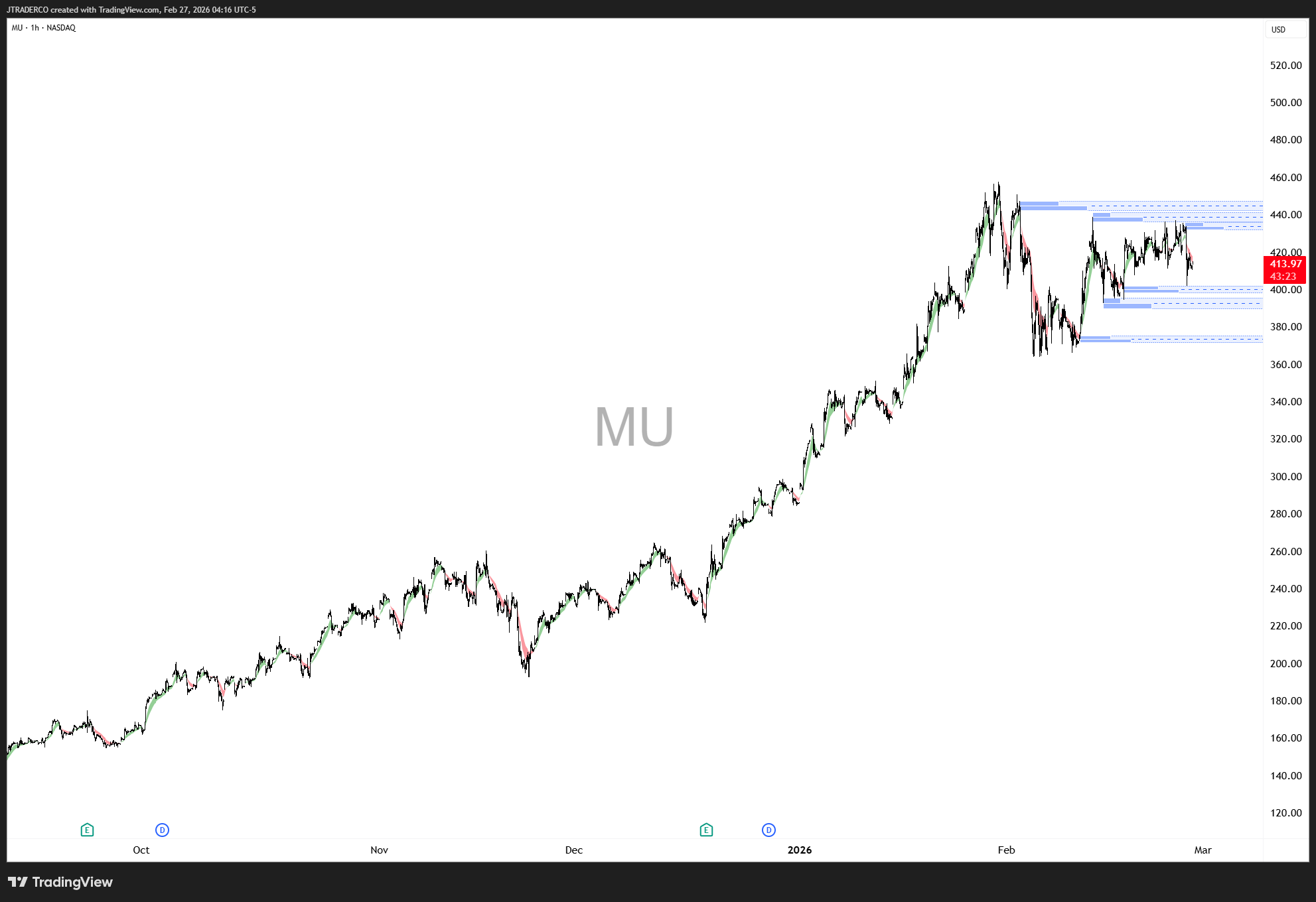 Grafico di MU sul Nasdaq, che se dovesse tenere i 400$ allora nuova target $500.