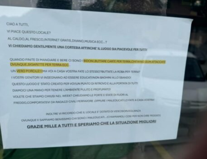 Il messaggio, diretto e senza filtri, è un misto di rabbia e delusione. Parte elencando i comfort offerti gratuitamente ai ragazzi – “Al caldo, al fresco, internet gratis, divano, musica” – per poi passare a una richiesta di semplice cortesia, affinché “il luogo sia piacevole per tutti”. Ma è sulle abitudini di alcuni utenti che il tono si fa esasperato. “Quando finite di mangiare e bere ci sono i bidoni”, si legge nel cartello, che prosegue descrivendo una situazione insostenibile: “Buttare carte per terra, chewing gum attaccate ovunque, sigarette per terra. Un vero porcile! Ma a casa vostra fate lo stesso?”.