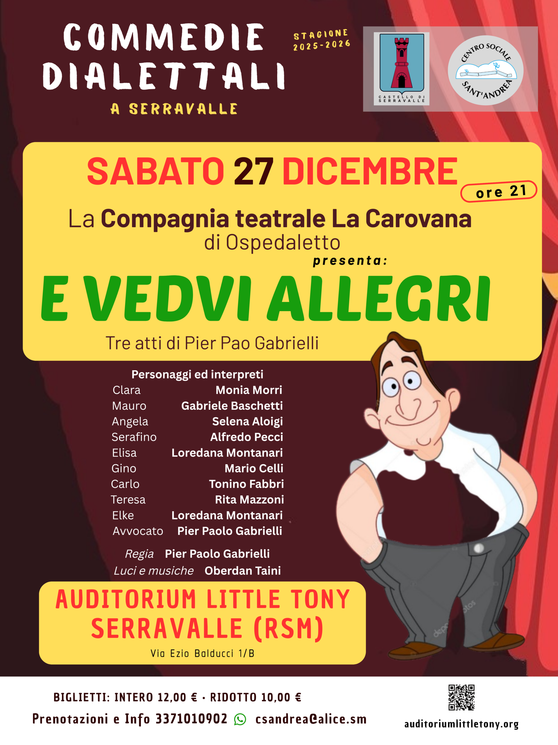 Si svolgerà SABATO 27 DICEMBRE, inizio alle ore 21, la Compagnia Teatrale LA CAROVANA di Ospedaletto, proporrà la commedia E VEDVE ALLEGRE, tre atti comici di Pier Paolo Gabrielli, all’Auditorium Little Tony a Serravalle (RSM). L’evento organizzato dalla Giunta di Castello di Serravalle e dal Centro Sociale S. Andrea.