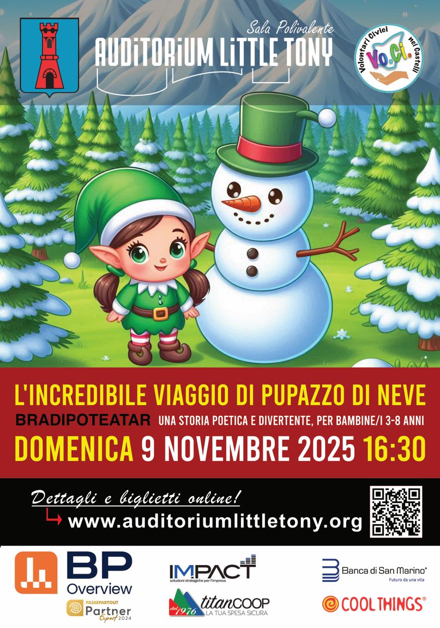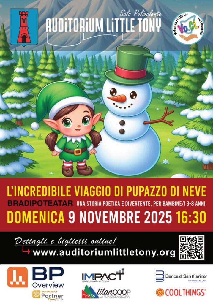 Un pupazzo di neve che prende vita grazie alla magia di un’elfetta smarrita e all’aiuto dei bambini in platea. È la favola interattiva che andrà in scena domenica prossima, 9 novembre, all’Auditorium Little Tony di Serravalle. La compagnia Bradipoteatar porta sul Titano “L’incredibile viaggio di Pupazzo di Neve”, uno spettacolo per famiglie e bambini inserito nella rassegna teatrale “Piccoli Sguardi 2025”.