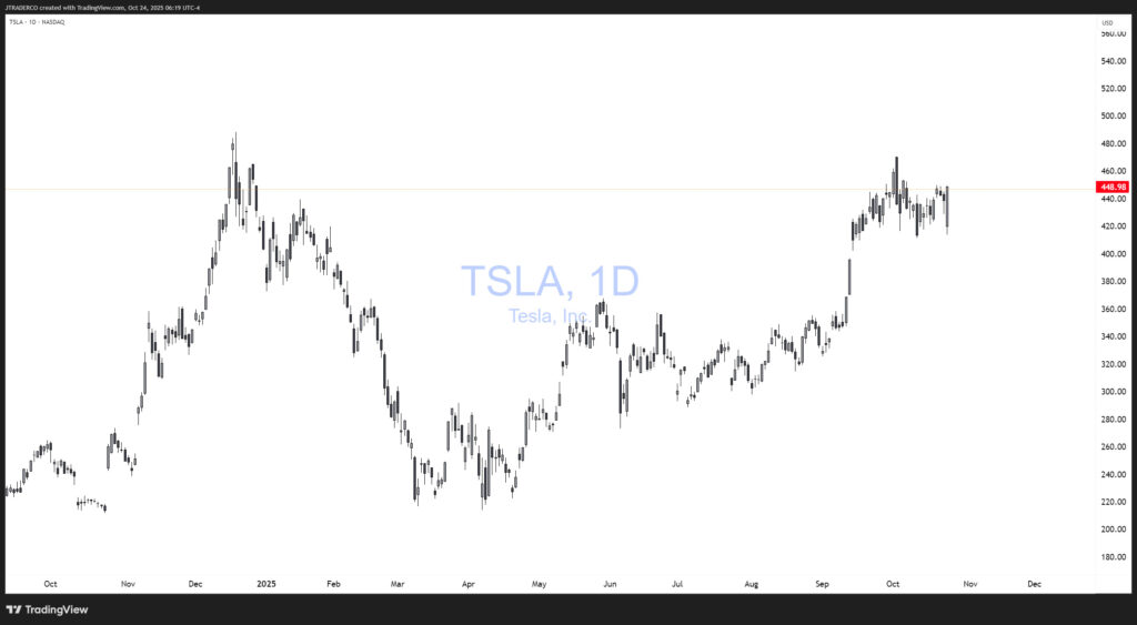 Settimana movimentata anche per Tesla, che dopo la pubblicazione degli utili ha subito una discesa di circa 40 punti mercoledì, per poi recuperare interamente il terreno perso. Attualmente il titolo si trova in area 450 dollari, una resistenza chiave: un eventuale superamento di questo livello potrebbe aprire la strada verso 480, mentre sotto i 440 aumenterebbe la pressione ribassista di breve termine.