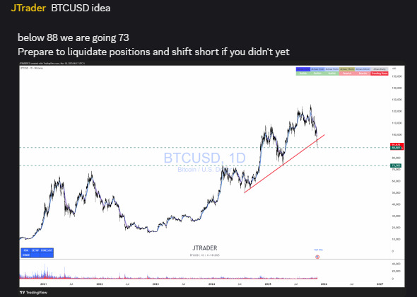 Nella free telegram room dove siete tutti invitati abbiamo chiamato uno short a 92.000, oggi il prezzo tocca 82.000 con target 73.000. Questo in pochi giorni.