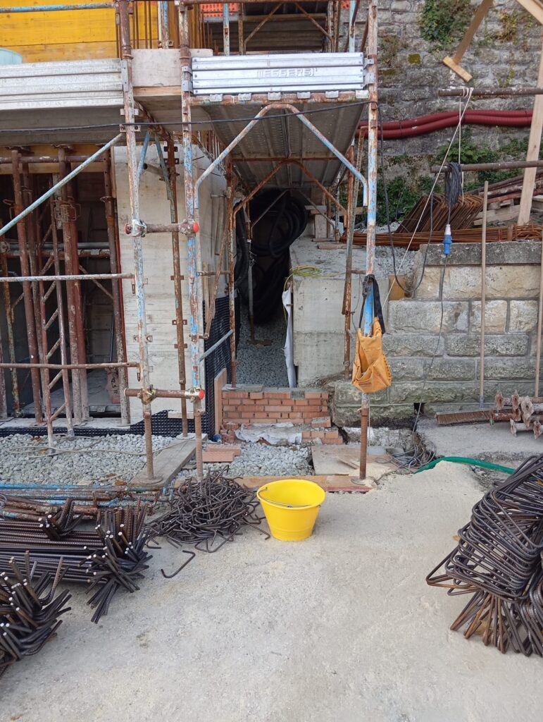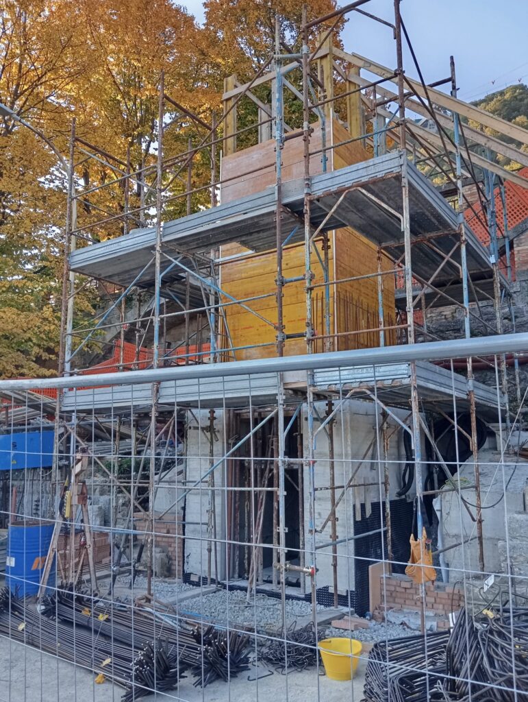 In questi giorni è stata completata la cunetta di drenaggio posta alla base del cantiere, un’opera fondamentale per garantire la stabilità del terreno e la corretta regimentazione delle acque piovane. Subito dopo, è stato montato il ponteggio e si è passati alla fase di armatura del secondo livello del setto, struttura portante in calcestruzzo che fungerà da protezione e sostegno alla futura gabbia ascensore.