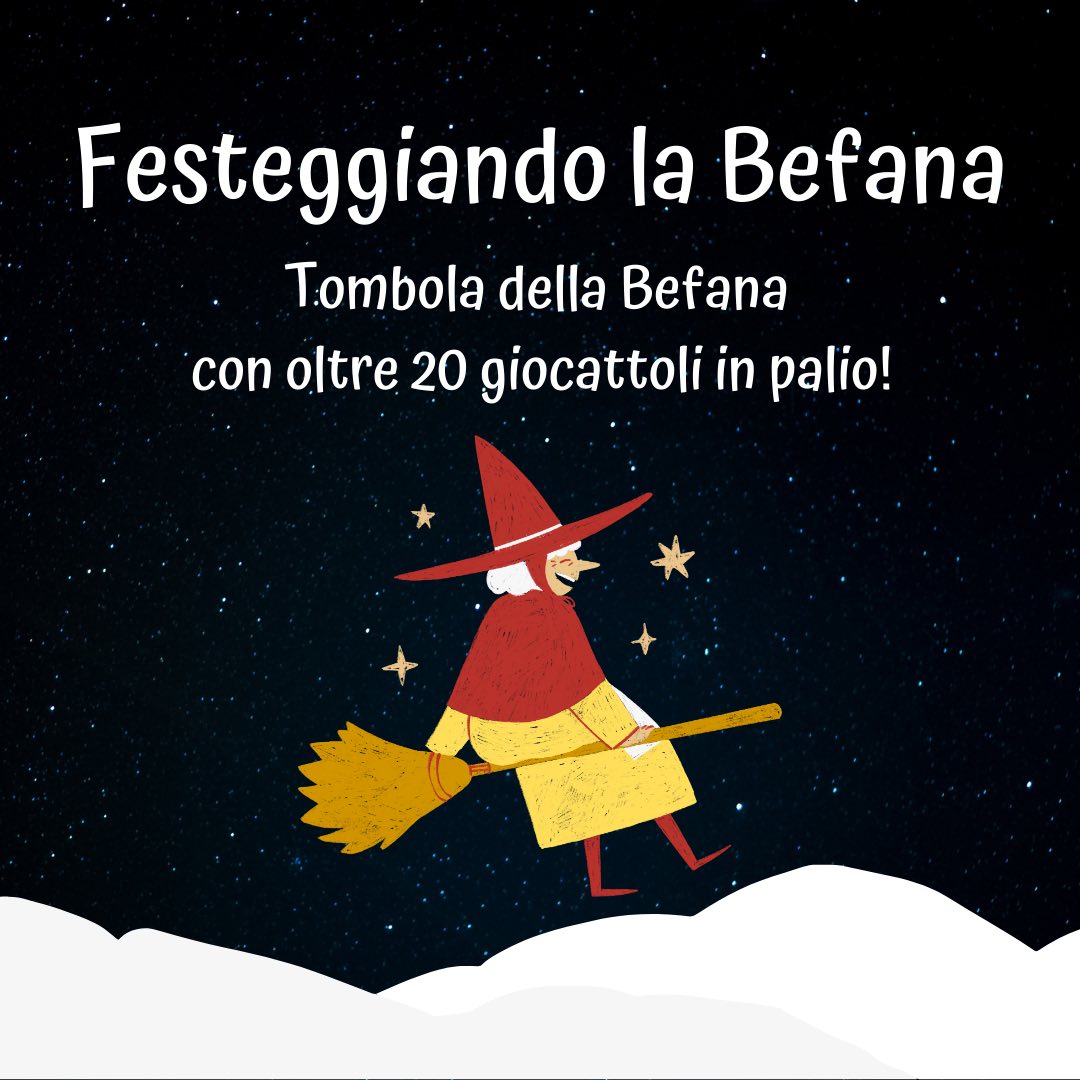Inoltre ci sarà il Giro della Befana con oltre 20 giocattoli in palio (Fiat 500 Barbie – Drone – Pista Spidey – Cane Pelusc – Bob – Gioco dell’Oca – Gioco della Tombola – e tanti altri premi..)