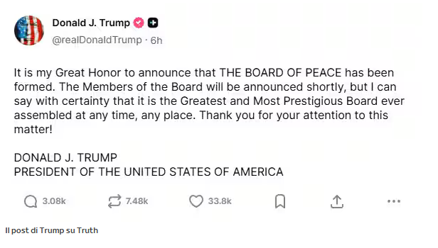 Una svolta diplomatica accompagnata da un ultimatum militare. Donald Trump sceglie ancora una volta la sua piattaforma Truth Social per ridisegnare gli equilibri dello scacchiere mediorientale. In un messaggio diffuso nelle prime ore di oggi, il Presidente degli Stati Uniti ha ufficializzato la creazione del “Board della pace” per Gaza, definendolo senza mezzi termini “il Consiglio più grande e prestigioso mai messo insieme in qualsiasi momento e in qualsiasi luogo”. Ma dietro i toni trionfali si cela un avvertimento perentorio rivolto ai miliziani: consegnare le armi subito, o affrontare le conseguenze.