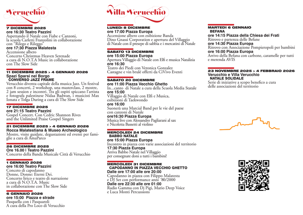 Il Natale si accende ufficialmente a Verucchio: domenica 7 dicembre prende il via il ricco programma di eventi che animeranno il borgo antico e Villa Verucchio per tutto il periodo festivo. La prima settimana è un intenso intreccio di tradizione, cultura, suoni moderni e occasioni di ritrovo, come annunciato dall’Ufficio Stampa del Comune di Verucchio.
